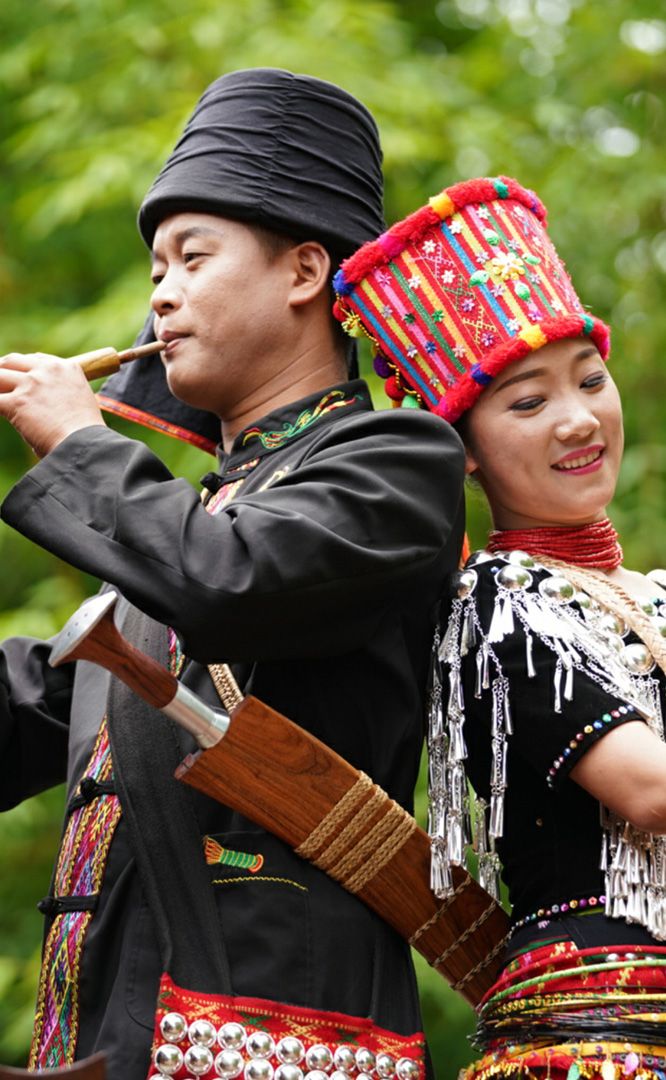德昂族人口約1.7萬,主要分布在德宏州和保山市的潞西、梁河、瑞麗、隴川、隆陽等縣區(qū)。民居多為草排覆頂竹木結(jié)構(gòu)的干欄式建筑,眼前的德昂村建筑納入了能容納數(shù)十人居住的德昂大房子,氈帽頂?shù)男》孔樱€有頗具浪漫色彩的大公房、小公房……還建有“龍陽塔”標志及佛教奘房、佛塔。德昂族民間普遍信奉南傳佛教,民俗活動與佛事活動關(guān)聯(lián)緊密。潑水節(jié)、開門節(jié)、關(guān)門節(jié)是重大節(jié)日。德昂族服飾色彩豐富,口頭文學(xué)特別是民歌創(chuàng)作活動...